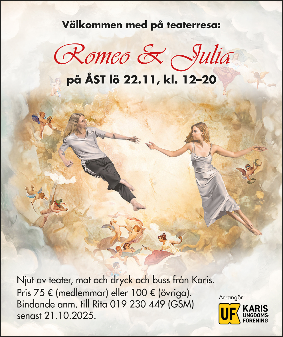 Föreställningen börjar kl.14. Vi ser Romeo och Julia, älska och dö, ett klassiskt verk av Shakespeare. Efter föreställningen gemensam mat på ett mysigt ställe. Vi beräknas vara tillbaka i Karis ca kl. 20.